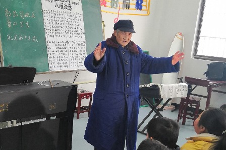 “遵守紀律人人要自覺,互相監(jiān)督切莫違反了,革命紀律條條要記清,人民戰(zhàn)士處處愛人民。”在定遠縣朱灣小學的音樂教室里,一群孩子正在聚精會神地上音樂課,黑板中央掛著用毛筆抄寫的《三大紀律八項注意》的曲譜和歌詞。這是已經(jīng)91歲高齡的嚴明友老師的課堂,他對孩子們說道:“我們今天學的不是一首普通的歌曲,它能教我們做人的道理。希望你們學會這首歌的同時,也能繼承這種優(yōu)良的革命傳統(tǒng),做一個懂紀律、守規(guī)矩的有用之才。”在嚴老師的課堂里出現(xiàn)最多的就是革命歌曲,而這些鏗鏘有力的曲調(diào)也總能讓他回憶起過去的軍旅時光。