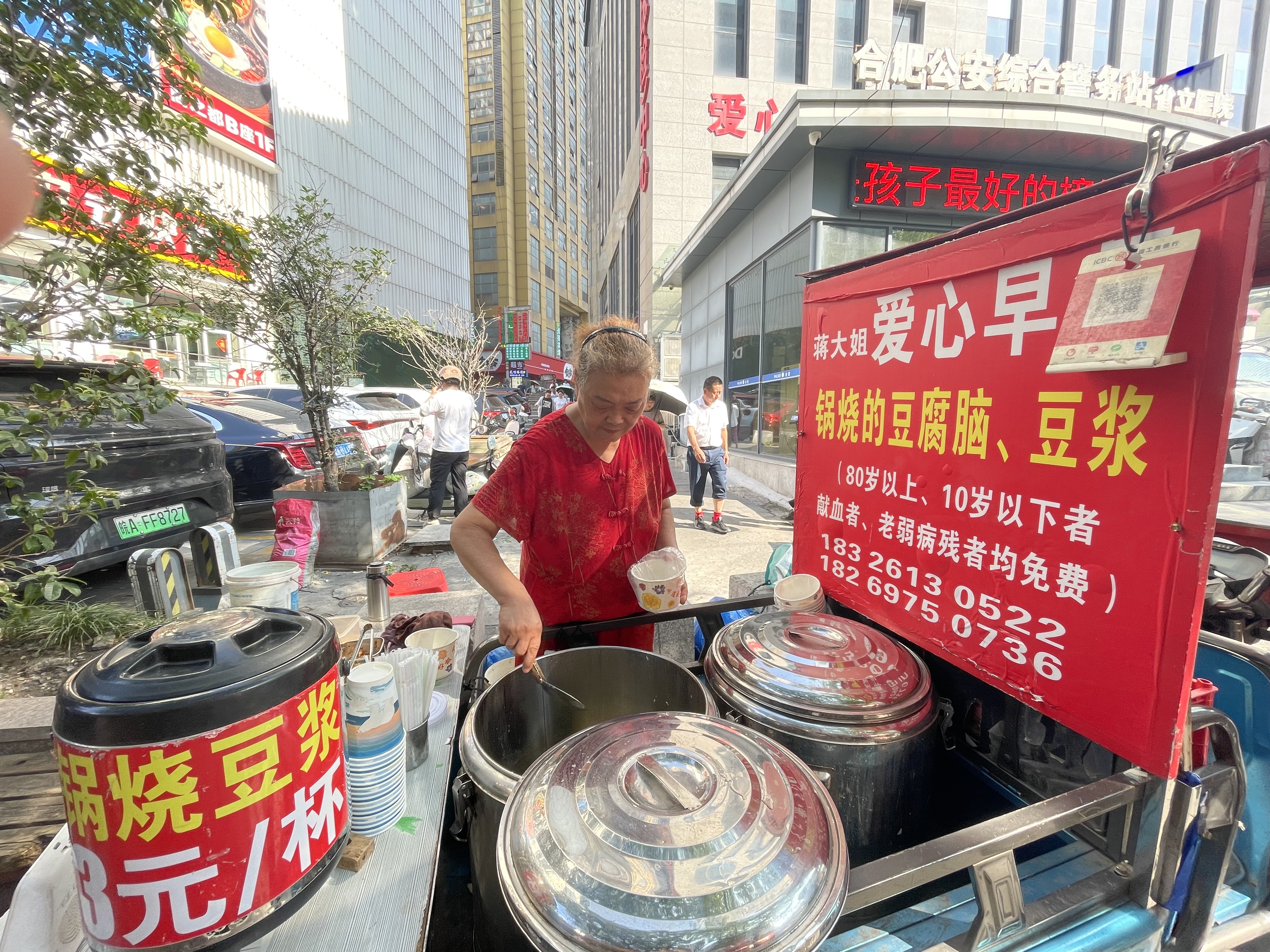 本網訊(記者 陸迪)清晨五點半,天色微亮,中科大附一院安徽省立醫院(總院)前,68歲的蔣同扣已推著她的“愛心早餐車”準時出現。車身上紅底黃字的廣告牌格外醒目:“80歲以上老人、10歲以下兒童、持有獻血證等人免費。”