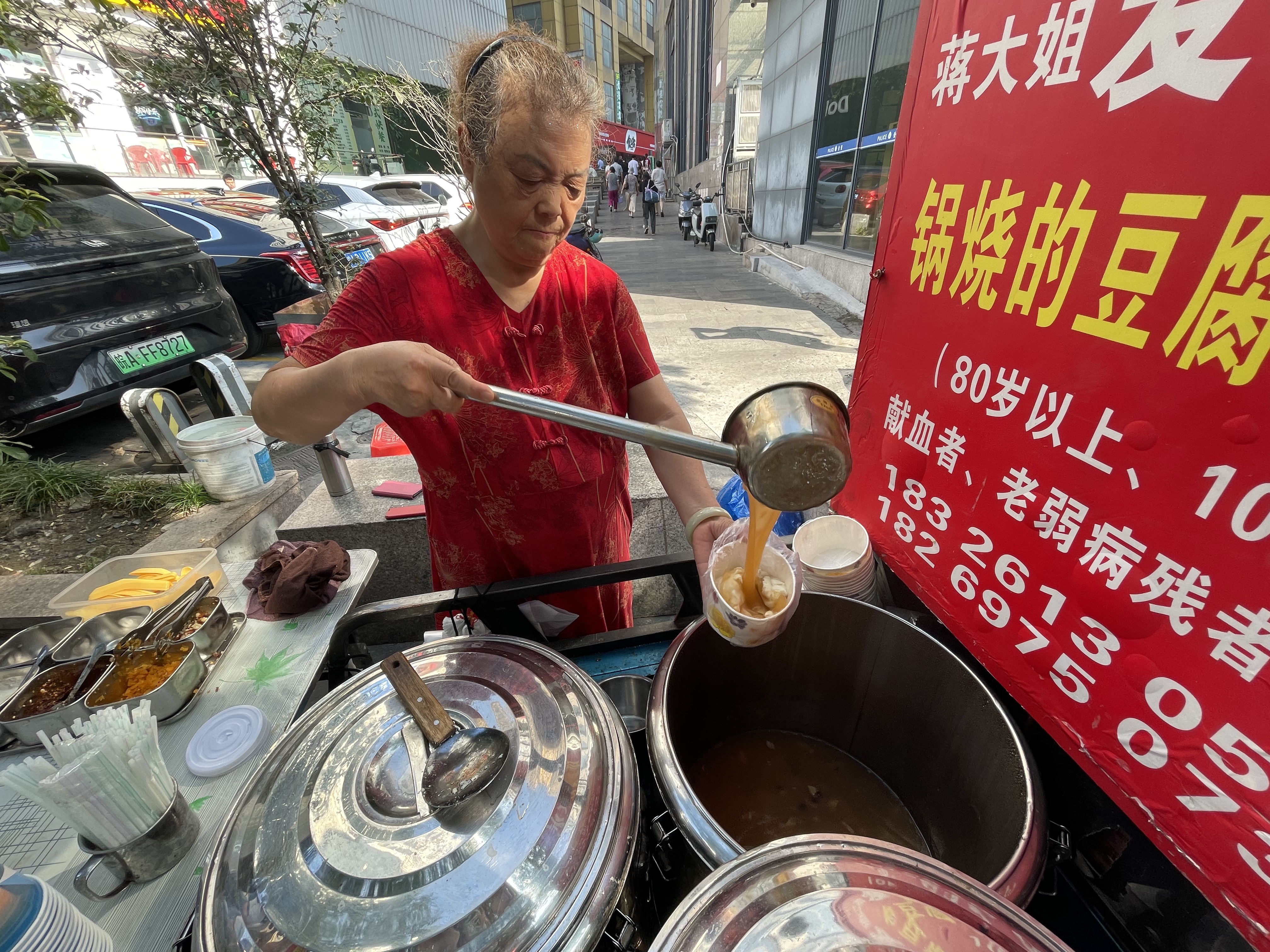 如今,她的免費范圍早已超出招牌上的文字,遇到殘疾人士、衣著陳舊的行人,她會主動遞上熱乎的豆腐腦。每天收攤前,還會打包一些送到附近獻血站,送碗豆腐腦表心意。