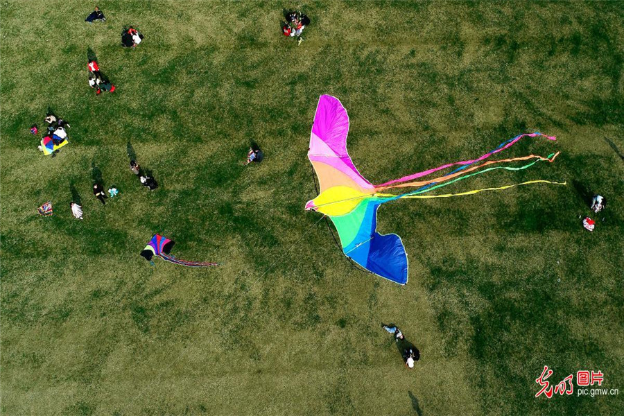 2019年3月10日,安徽廬江縣少年兒童在全民健身運動中心放風箏,盡情享受快樂春光。(王閩攝/光明圖片)