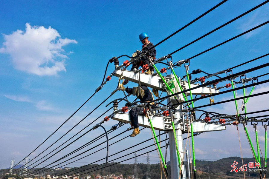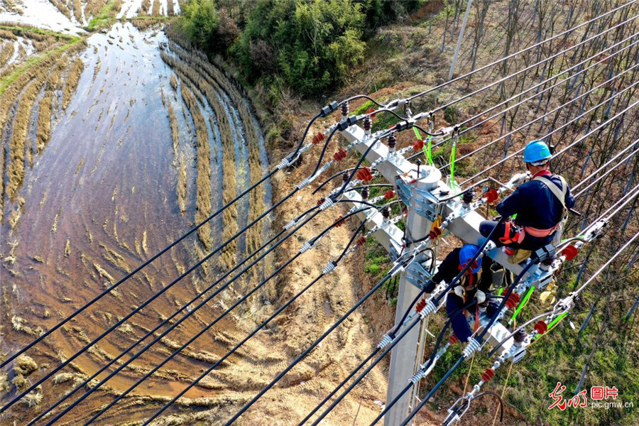 2019年3月14日,為保障農業生產用電安全,安徽省廬江縣供電公司組織210名黨員組成18個"春耕保電服務隊",深入鎮村田間地頭,檢修農灌線路。(左學長攝/光明圖片)