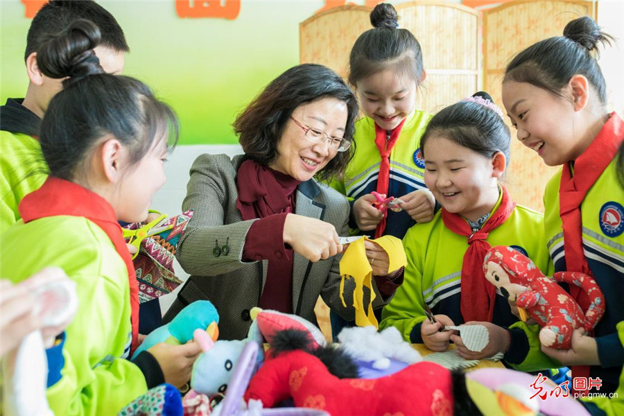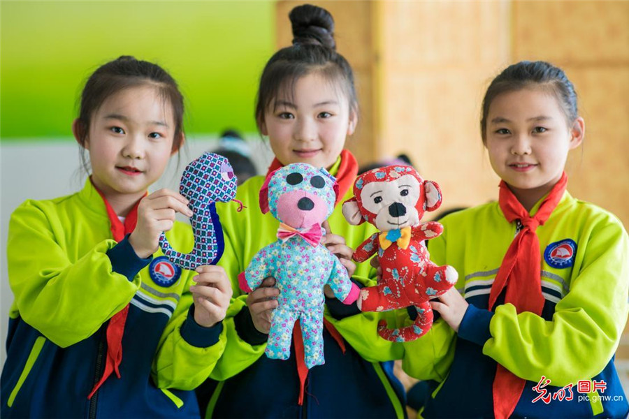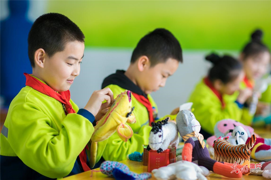 2019年3月18日,內蒙古呼和浩特市玉泉區通順街小學開設宣傳低碳環保理念的手工小課堂,孩子們在老師的帶領下,利用身邊的廢舊布頭,絲綿、紐扣等制作小布藝作品,培養孩子們勤儉節約和低碳環保的意識。(丁根厚攝/光明圖片)