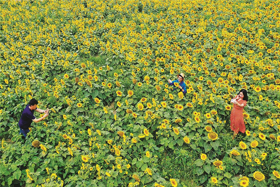 6月25日,在亳州市譙城區十河鎮藥都四季花海,游客在向日葵花間拍照賞景。連日來,當地種植的向日葵花陸續綻放,像一張張“笑臉”迎風搖曳,令游人流連忘返。 本報通訊員 劉勤利 戴明 攝