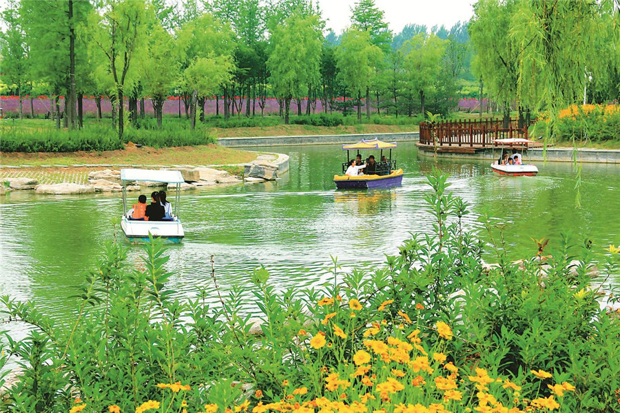 日前,游客在風景如畫的淮北濉溪縣百善鎮中國大運河·柳孜文化園內的月亮湖劃船游玩。濉溪縣近年來積極打造全域旅游,助推鄉村振興,推進農業與旅游、文化、健康休閑等產業深度融合。 本報通訊員 周方玲 攝