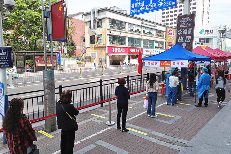 廬陽區逍遙津街道第二社區醫院門口核酸檢測點排起長隊,工作人員正在進行核酸檢測。