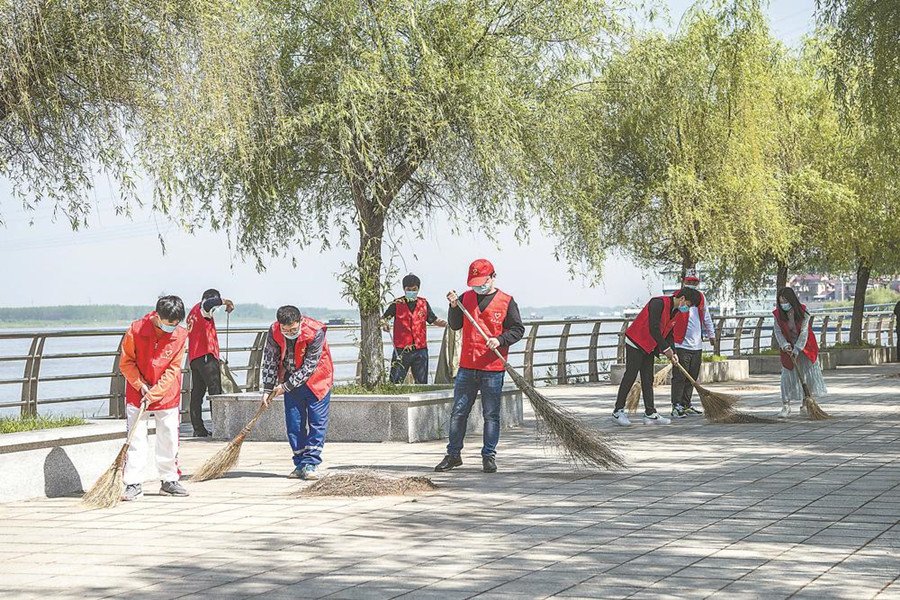 5月3日,蕪湖市繁昌區荻港鎮濱江公園,共青團員們在開展志愿服務活動。 通訊員 肖本祥 攝