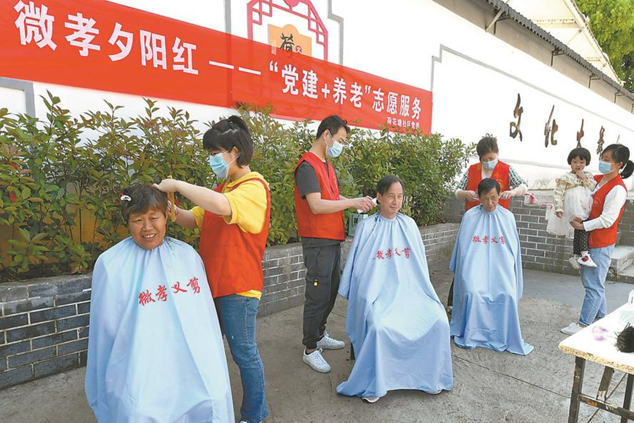 5月4日,安慶市迎江區荷花塘社區黨委組織青年志愿者開展“微孝義剪”活動,免費給社區老年人理發。 通訊員 黃有安 攝