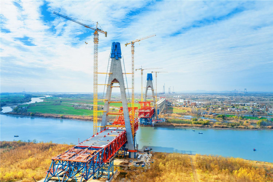 日前航拍的位于當涂縣的巢馬城際鐵路馬鞍山公鐵兩用長江大橋建設現場。該大橋是巢馬城際鐵路的控制性工程,建成通車后,可進一步拉近合肥都市圈與南京都市圈之間的時空距離。
