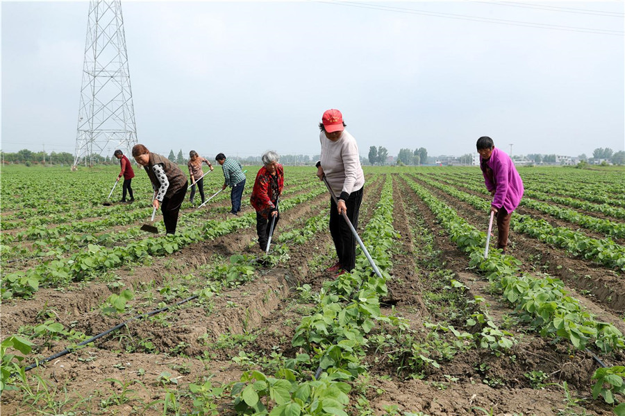 5月5日,蒙城縣小辛集鄉(xiāng)李大塘村農(nóng)民正在田間勞作,清除大豆田里的雜草。立夏時節(jié),該縣鄉(xiāng)村田間地頭到處是一派忙碌景象。 通訊員 胡衛(wèi)國 攝
