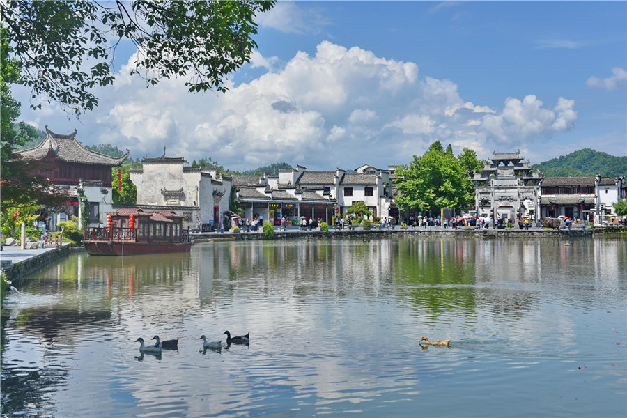 5月23日,黃山市黟縣西遞景區風景迷人,碧水、樹木與徽派古民居相映成趣,吸引眾多游人前來游玩。