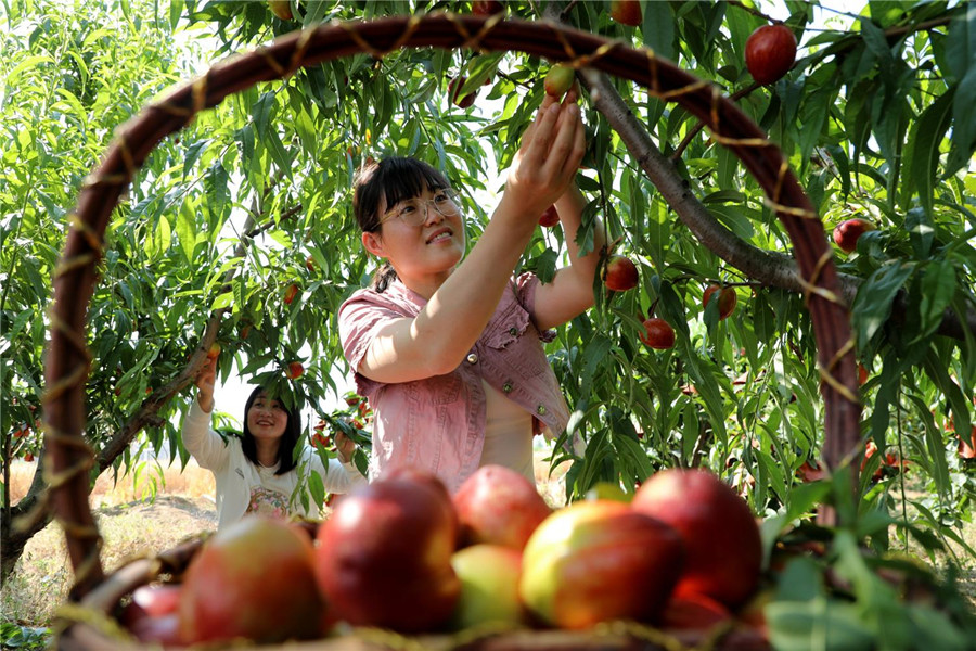 5月23日,游客在阜陽市潁東區新華街道老集村愛飛家庭農場采摘油桃。近年來,阜陽市潁東區大力發展集生態旅游、休閑觀光、農事體驗于一體的“農旅融合”特色果園,促進村民致富增收。通訊員 宿 飛 攝