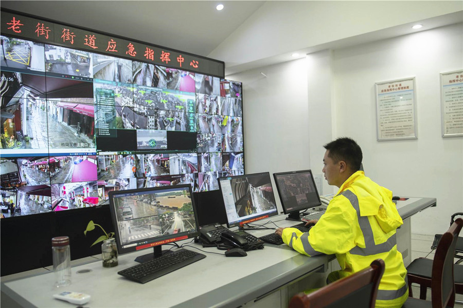 6月26日,在黃山市屯溪區老街街道應急指揮中心,老街專職消防隊隊長程順富查看全國重點文物保護單位屯溪老街內積水情況。新華社記者 傅 天 攝