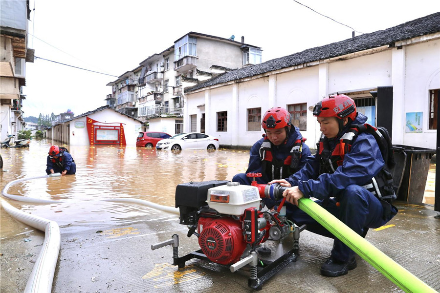 6月23日,黃山市消防救援支隊屯光特勤站指戰員在黃山市屯溪區進行排澇作業。記者 許 昊 攝