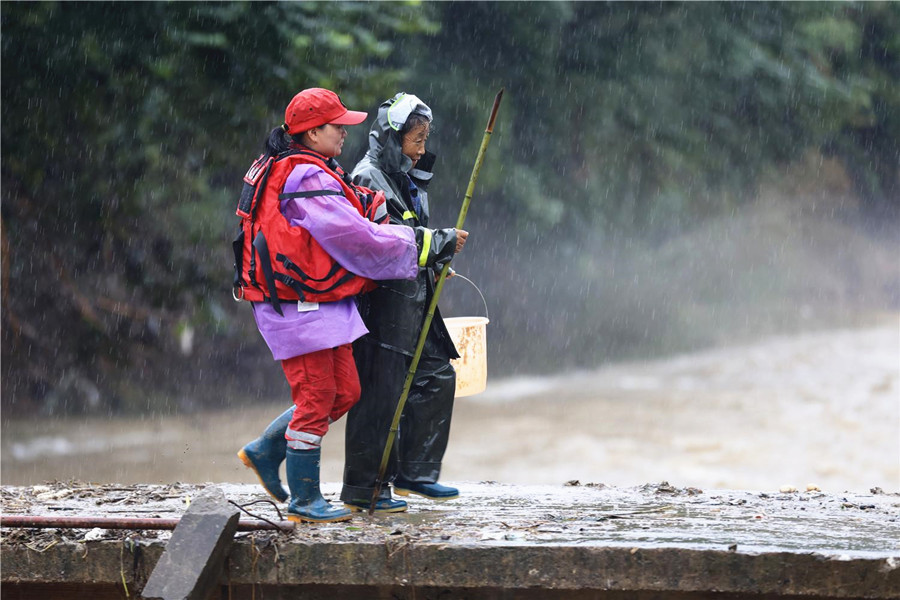 6月26日,山越救援隊隊員程紅梅(左)在黃山市歙縣紹濂鄉和平村幫助村民過橋。新華社發(樊成柱 攝)