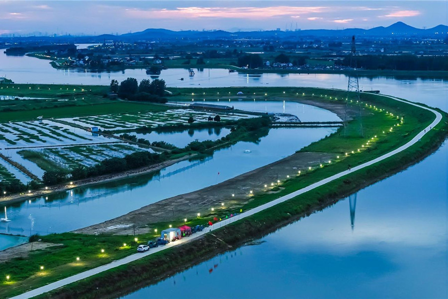 7月17日晚,防汛應(yīng)急照明燈點(diǎn)綴于馬鞍山市博望區(qū)新市鎮(zhèn)運(yùn)糧河防汛大堤上,筑起了一道明亮防線。連日來,博望區(qū)1000多名黨員、志愿者等,守護(hù)著35.7公里防汛大堤。