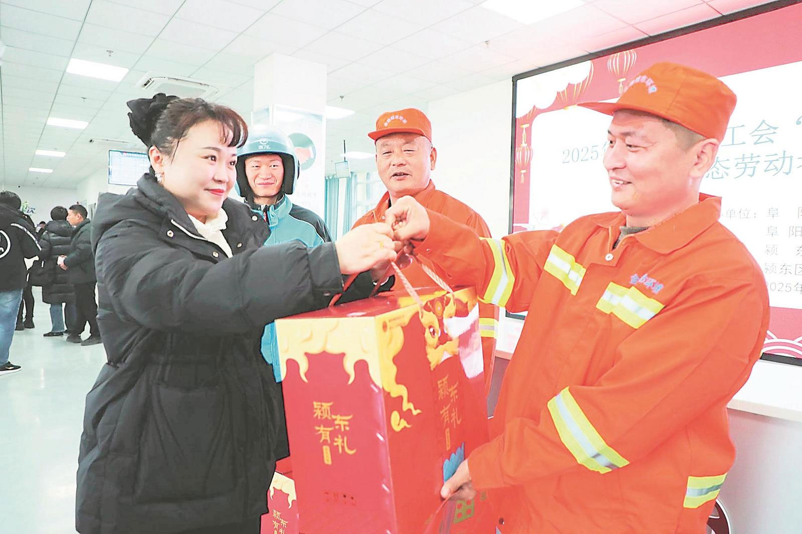 1月17日,在阜陽市潁東區(qū)數(shù)據(jù)資源管理局工會(huì)驛站,工作人員為戶外勞動(dòng)者發(fā)放新年大禮包。當(dāng)日,阜陽市總工會(huì)等部門開展走訪慰問活動(dòng),為戶外勞動(dòng)者送上冬日里的暖心關(guān)懷。通訊員 宿飛 趙錦萱 攝