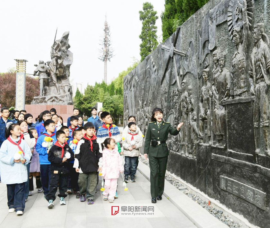 圖為3月29日,部分中小學生在阜陽市和平公園烈士浮雕旁聆聽講解員講述英烈事跡。