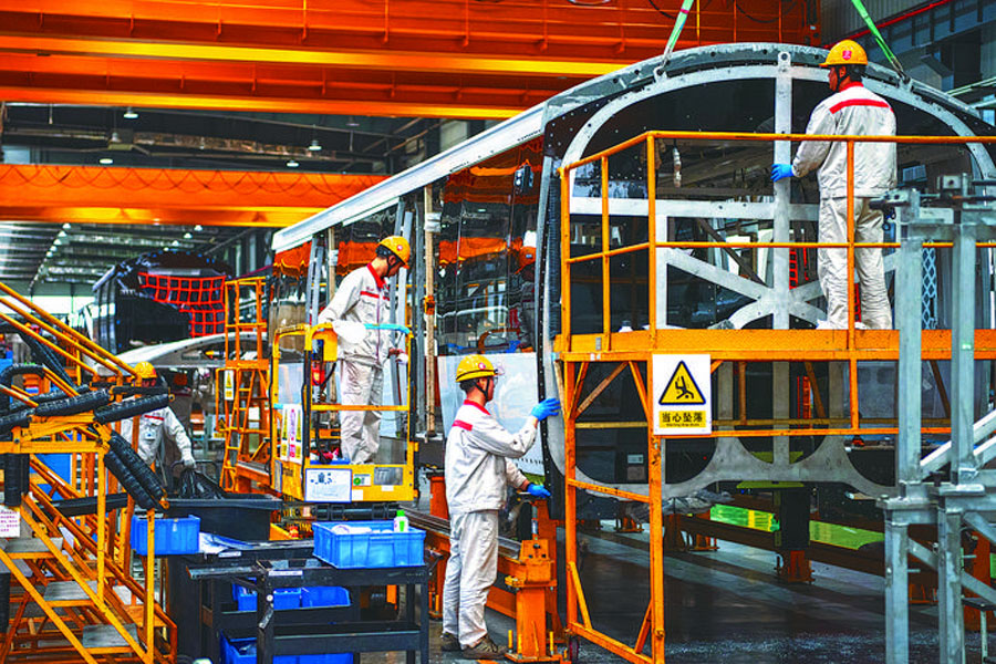 蕪湖經濟技術開發區的中車浦鎮阿爾斯通運輸系統有限公司車間里,工人在生產制造無人駕駛軌道列車。肖本祥 攝