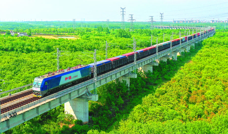 滿載貨物的中歐班列行駛在合肥市蜀山區段鐵路線上。陳三虎 攝