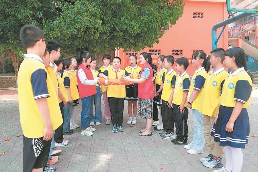5月14日,樅陽(yáng)縣樅陽(yáng)小學(xué),志愿者在講解和演示專(zhuān)業(yè)救生圈的使用方法。連日來(lái),樅陽(yáng)縣各中小學(xué)校組織開(kāi)展“防溺水 護(hù)安全”活動(dòng),提升學(xué)生防溺水安全意識(shí)。