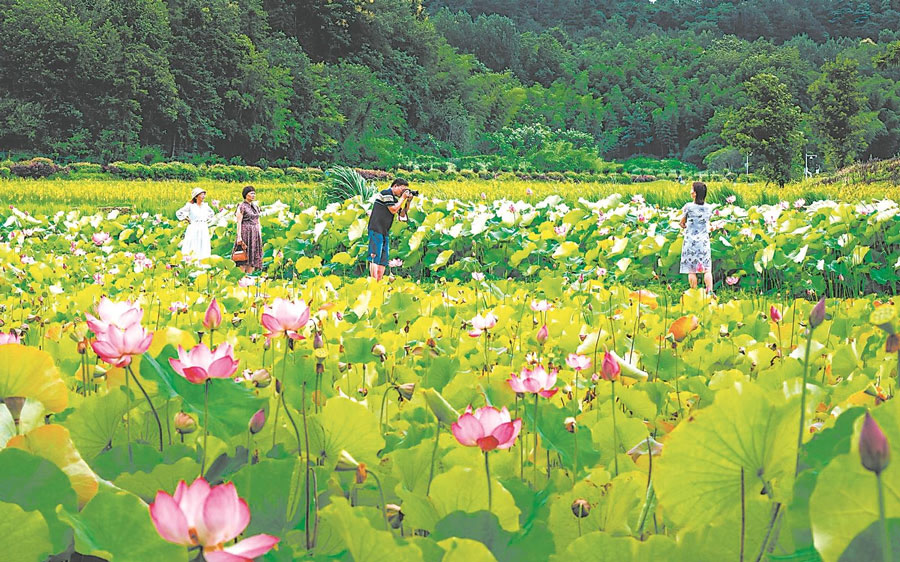 6月21日,蕪湖市繁昌區繁昌窯遺址公園里荷花盛放,市民紛紛前來游玩賞荷,樂享夏日清涼。通訊員 肖本祥 攝