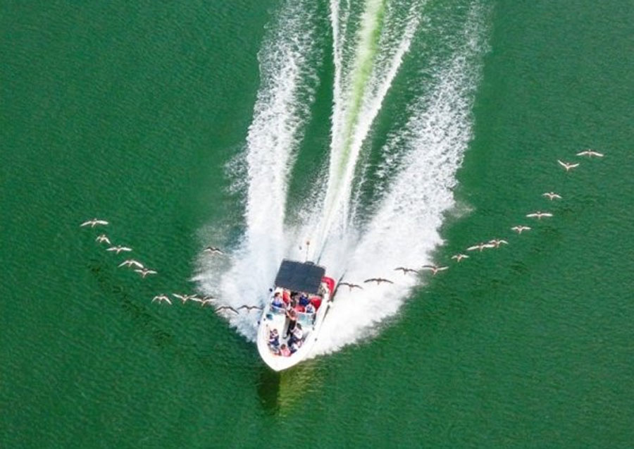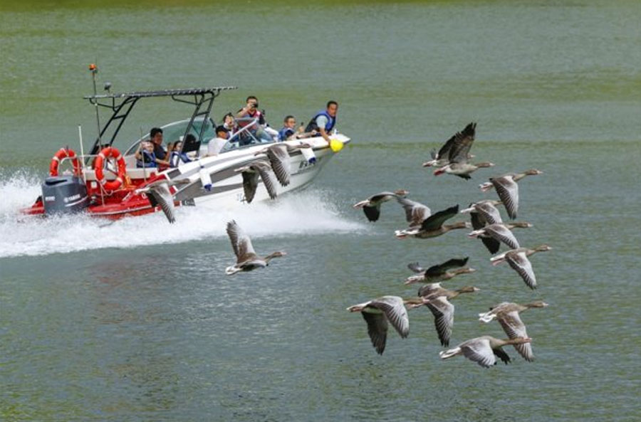 當日,游客搭乘快艇破浪而行,數十只經專業訓練的鴻雁展翅凌空、優雅伴飛,與青山碧水相映成趣,共同勾勒出一幅人與自然和諧共生的生態畫卷。
