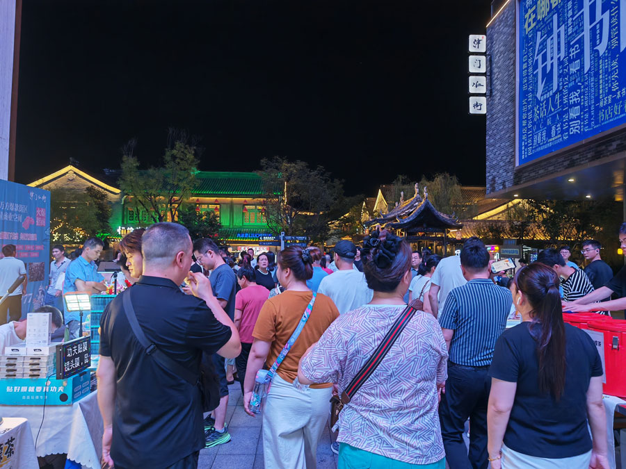 8月23日傍晚,華燈初上,霓虹閃爍,古色古香的塘溪津門水街游人如織。以宋式文化為底蘊的津門水街,不僅匯集各色美食,還有各類國風文創小鋪。夜幕降臨,美輪美奐的水光交融表演更是吸引大量游客來此打卡消費?!耙菇洕辈粌H點亮了城市的夜色,也在不斷激發消費新活力。(賀鵬云)