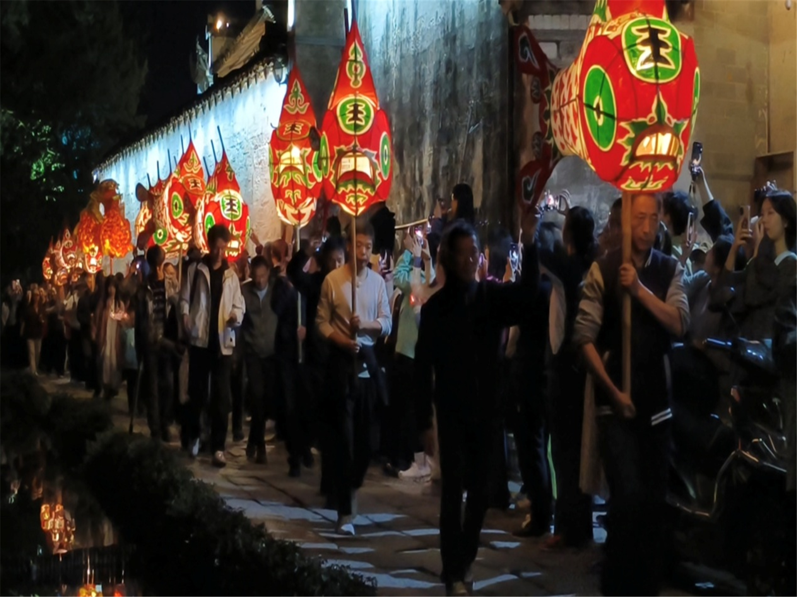 當(dāng)夜幕降臨,一場別開生面的非遺魚燈巡游將氣氛推向高潮。村民們手持各式魚燈,在游客的簇?fù)砼c喝彩中蜿蜒前行,穿梭在宏村古老的拱橋和街巷間,璀璨的光影在南湖流淌,為靜謐的古村注入了鮮活的生命力。游客紛紛手持魚燈合影留念,沉浸式感受徽州獨(dú)特的文化魅力。(史洪芳 文/圖)