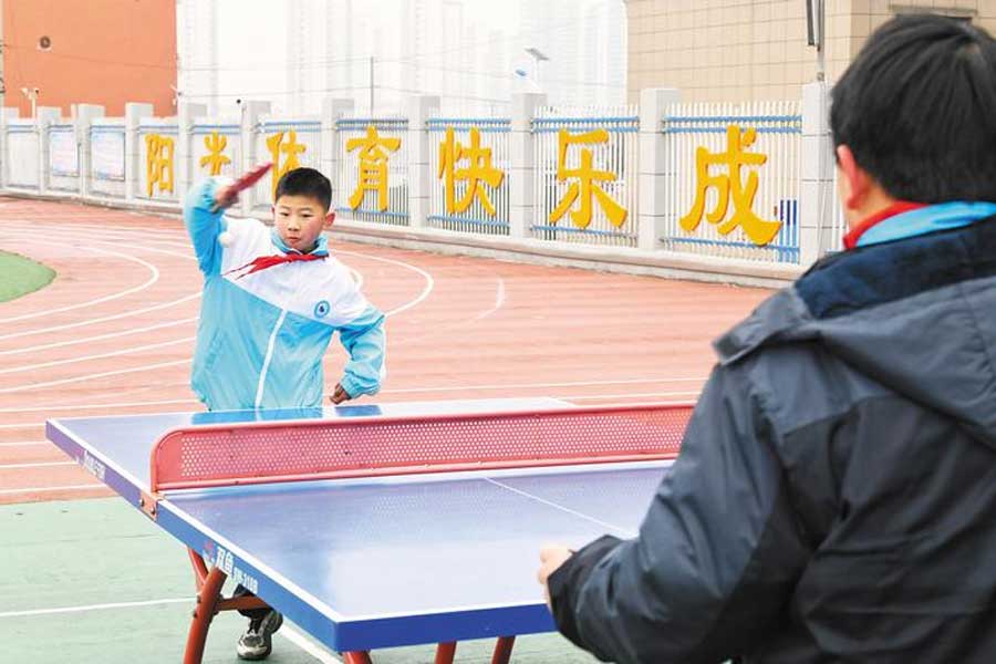 合肥市運河小學教育集團小廟校區(qū),小朋友在大課間打乒乓球。陳三虎 攝
