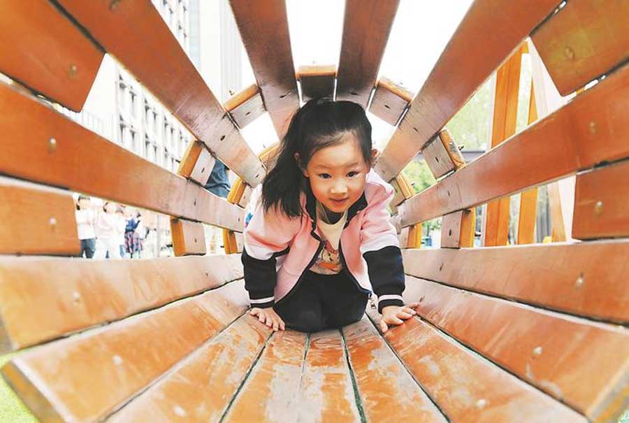 合肥市保利熙悅府幼兒園,孩子們在大課間參加“過山洞”體育游戲。熊偉 攝