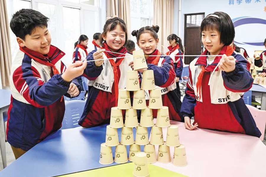 廬陽區(qū)紅星路小學國際部,學生正在室內(nèi)進行大課間夾夾樂游戲活動。趙明 攝