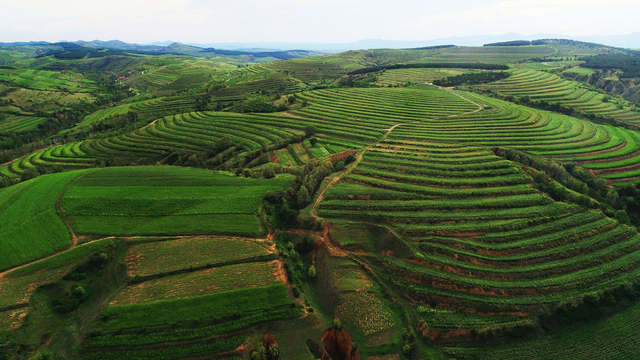 “踏山行川,不如三十二連山梯田望遠”。在敖漢旗三十二連山遠眺,滿目梯田交錯、綠帶連天。